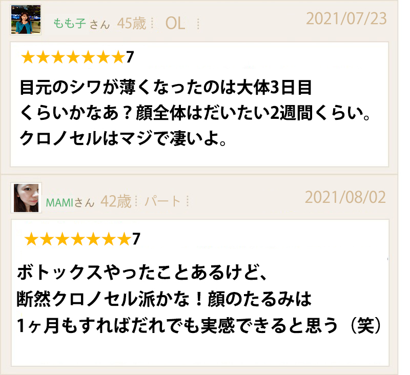 クロノセルを使ってから、たるみはもちろんシミやほうれい線なるものも解決しちゃって…もう気分は20代です♪先日、なんと20代の娘の姉に間違えられて😲😲クロノセル…神ですね!!