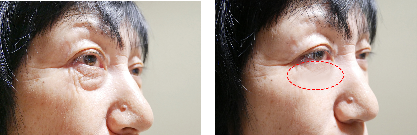 目元のたるみ。